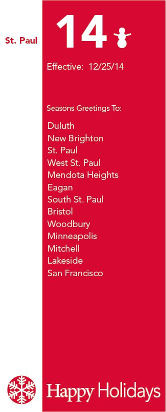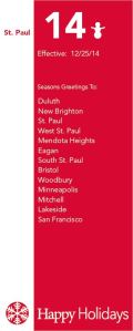 Document Design Postcard from Dayton’s Bluff (content adapted from Donald Empson’s “The Street Where You Live”) Christmas Card, 2014 (styled after 90s-era Metro Transit bus schedules)